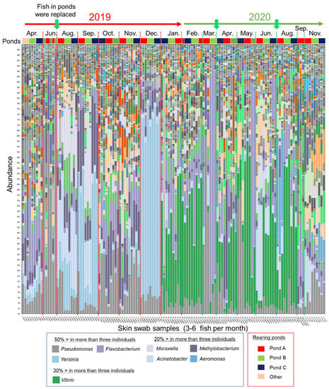 Bacterial composition in the epidermal mucus of rainbow trout reared in a flow-through aquaculture pond. The stacked bar chart shows the composition and abundance of operational taxonomic units (OTUs) (top-100, at the genus level) in epidermal mucus samples. The samples were collected every 1 to 2 months in 2019 and 2020. Green arrows indicate when all the fish in the ponds (Ponds A, B, and C) were replaced. The more abundant bacterial genera (e.g., >50% in more than three individual fish) are indicated in the figure legend.