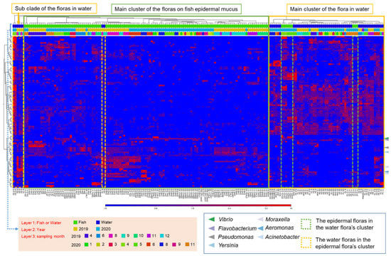 To examine the cause of fluctuations in the epidermal microflora of fish in the aquaculture system, we next analyzed the relationship with the bacterial flora in the rearing water and river water, which could potentially influence the composition of the mucus layer bacteria. The compositions of the microflora of the epidermis, rearing water, and river water samples, by month, were clustered based on the abundance of the OTUs that frequently appeared in the samples (top-100 OTUs). The results showed that the bacterial flora composition of the rearing water, river water, and epidermal mucus sampled in the same month usually fell into different clusters and the similarity among them was low, even though the compositions of some epidermal mucus flora and that of water microflora were similar in some months (Figure 2). Furthermore, the proportions of different bacterial genera in the mucus were independent of those in the water, whereby specific bacteria occupied the mucus and fluctuations occurred specifically in the mucus flora.
