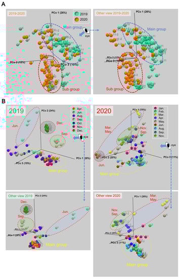 Beta-diversity of the skin mucus bacterial flora of rainbow trout in flow-through aquaculture. (A) For β-diversity, the weighted UniFrac distance was calculated using all data from both years (2019 and 2020), and the data are visualized in a 3D-PCoA plot. The blue dotted circles represent the main group of the skin mucus bacterial flora, and the red dotted circles represent the subgroup. The number next to each dot indicates the sampling month; the other view from the indicated direction marked “eye” and with arrows is also shown. (B) The β-diversity was calculated using the data for each year separately. The yellow dotted circles represent the main group of the flora, and the red dotted circles represent groups that clearly differed from the main group. The number next to each dots indicates the sampling month; the other side view from indicated direction is also shown.