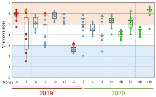 Alpha-diversity of epidermal mucus microflora of rainbow trout in a flow-through culture system. Shannon’s diversity index was calculated by rarefaction analysis, using 2.400 reads sampled randomly from each mucus sample. The results from 6–9 individual fish in each sampling month are represented by box plots; dots inside the boxes represent data from individuals, and the same color indicates fish reared from the eggs collected in the same fiscal year. Green triangles indicate months that the disturbance of the flora by specific bacteria was observed. Red triangles indicate the months that the occupation by specific bacteria was observed. The dotted green lines mark when fish were replaced on the farm.
