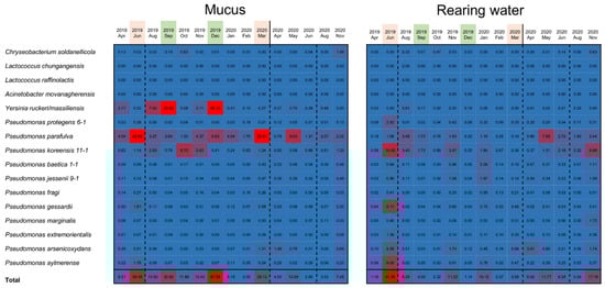 Confirmation of antimicrobial bacteria species in the epidermal mucus and rearing ponds of rainbow trout. Sequence reads randomly sampled from the data of each month (skin mucus samples and water samples) were mapped on the sequence list of the 16S rDNA V1–V2 region of antimicrobial bacteria isolated from the skin mucus samples. The number of reads mapped on the sequence for each antimicrobial bacteria was counted, and the proportion (%) of the mapped reads for each bacterium is presented as a heatmap (number of reads per total reads mapped on each bacterium). The months of observed disturbances of the flora are represented by pink, and occupation of the flora is represented by green.