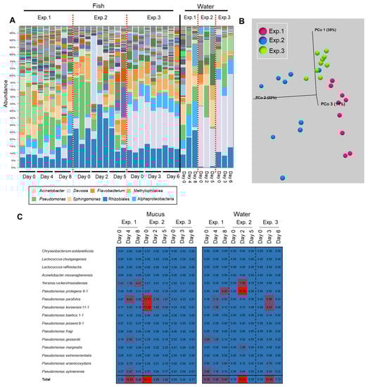 Results depicting a transition of the epidermal mucus bacterial flora of rainbow trout reared in a laboratory aquarium with a recirculating system. (A) The stacked bar chart shows the abundance of major bacterial flora in the epidermal mucus and rearing water, in an experiment performed three times (Exp. 1–3). (B) Beta-diversity measured by weighted UniFrac distance using fish skin mucus samples from Exp. 1, 2, and 3. (C) Reads mapped on the antimicrobial bacterial 16S rDNA sequences; the proportions of mapped reads from each day are depicted in a heatmap.