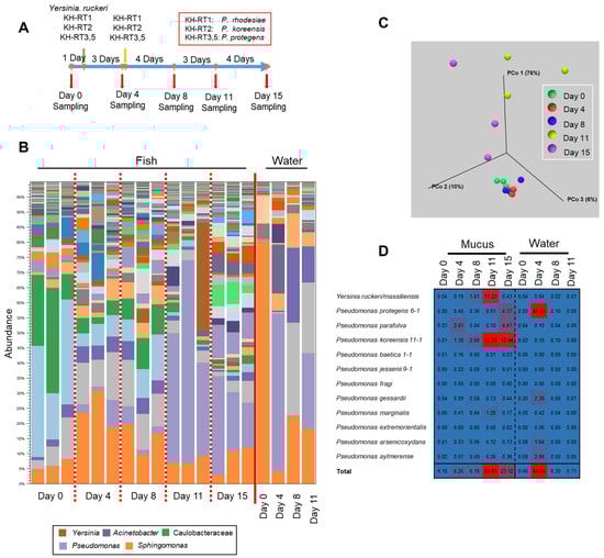 Transition of the epidermal mucus bacterial flora of rainbow trout by artificial administration of the antimicrobial Pseudomonas and Yersinia in laboratory aquaculture. (A) The schedule of the administration of the microbes and sampling of the fish and rearing water. (B) Stacked bar chart showing the abundance of major epidermal mucus bacterial flora of the rainbow trout before and after adding Pseudomonas marginalis KH-RT1, P. koreensis KH-RT2, P. protegens KH-RT3, and KH-RT5 and Yersinia ruckeri NCTC12266 to the rearing water. The Pseudomonas spp. were administrated twice during the experiment. (C) Beta-diversity, determined by the weighted UniFrac distance, calculated for the skin mucus samples obtained during the experiment. (D) Mapping reads of 16S rDNA sequences to the antimicrobial bacteria Pseudomonas and Yersinia; the proportion of mapped reads for each day are presented as a heatmap.