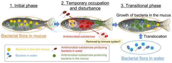 The proposed mechanism of the occupation, disturbance, and transition of the fish epidermal mucus bacterial flora by the bacteria with antimicrobial activity. The antimicrobial bacteria in the mucus and water contribute to the frequent change of the epidermal mucus microflora by occupying and disrupting the flora through the production of antimicrobial substances; this might cause a fluctuation in the proportions of epidermal mucus bacteria species and the transition of the flora by promoting the translocation of bacteria in the water and the growth of the indigenous mucus bacteria.