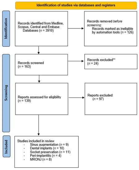 - Intervention: Peri-implantitis, socket preservation, and MRONJ treatments for patients; only articles with a control group and with data about the follow-up period were included;