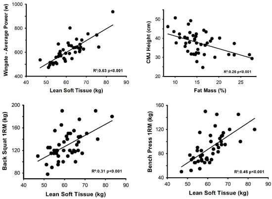 A stepwise regression was performed to identify the predictor variables most associated with performance in each test. Figure 1 illustrates that LST was the variable that best explained the variability of the results in the Wingate test, back squat and bench press 1RM tests, while %FM determined CMJ performance.