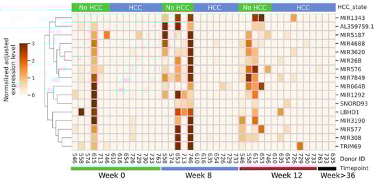 miRNAs predominantly or exclusively detected in the non-HCC group during the time course of this study. Donor IDs and the time point of each sample are indicated at the bottom, and the subsequent development of HCC, or lack of it, is shown at top. miRNA identity is shown on right, while normalized expression level key and hierarchical clustering is shown on left.