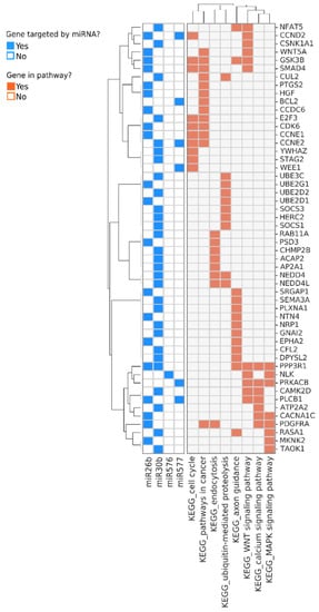 Genes and pathways regulated by the miRNAs that are predominantly or exclusively detected in samples from non-HCC donors. Genes targeted by the miRNAs are shown in rows and the most enriched pathways they participate in are shown at the bottom of the annotation matrix to the right. The annotation matrix to the left indicates the identity of the miRNAs (shown at the bottom left) which regulate each gene.