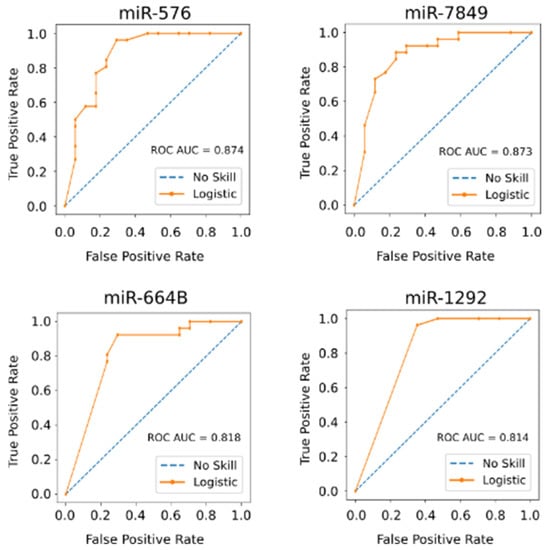 Four miRNAs show a very good ability to distinguish between the HCC and non-HCC group during treatment of HCV infection. The area under the curve (AUC) for each Receiver Operating Characteristic (ROC) curve based on logistic regression models for each RNA species was calculated. All samples throughout the time course of this study were used as test group.