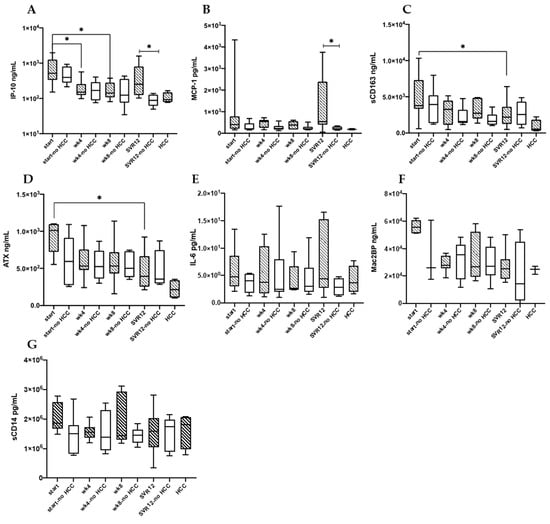 IP-10 (A), MCP-1 (B), sCD163 (C), ATX (D), IL-6 (E), Mac2BP (F), and sCD14 (G) serum levels are shown for HCC (n = 9) and no HCC (n = 7) groups at the beginning of DAA therapy (start and start no HCC indicating DAA therapy start for HCC and no HCC groups), through therapy (wk4, wk8), twelve weeks post-therapy (SVR12), as well as in the HCC group only once HCC developed (marked HCC). * p < 0.05.