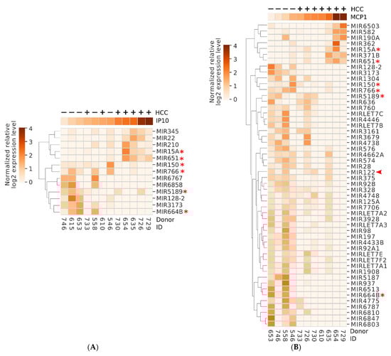 Five miRNAs, including miR15A, miR651, and miR22, positively correlated at r value > 0.6 with serum IP10, and were more commonly observed in those that developed HCC, while eight miRNAs including miR150 and miR766, negatively correlated with IP10 levels at this time point and were more commonly observed in controls (Figure 5A). Additionally, seven miRNAs positively correlated with serum MCP-1 levels and were more commonly observed in those that developed HCC including two miRNAs (miR15A and miR651) which were also positively correlated with IP10 (Figure 5B). On the other hand, over 40 miRNAs were negatively correlated with MCP-1 levels at this time point and were more commonly observed in controls (Figure 5B), including 6 that were shared with those negatively correlated with IP10 (Figure 5B, marked by asterisks), and miR122, a liver-specific miRNA known to be downregulated in dysplastic nodules in HCV positive patients, as well as HCC due to chronic HCV infection (marked by an arrowhead) [12,49,50]. Additionally, 36 and 2 miRNAs, including the liver-specific miR-196B, were found to positively or negatively correlate with albumin level in each donor, respectively (Supplementary Figure S1).
