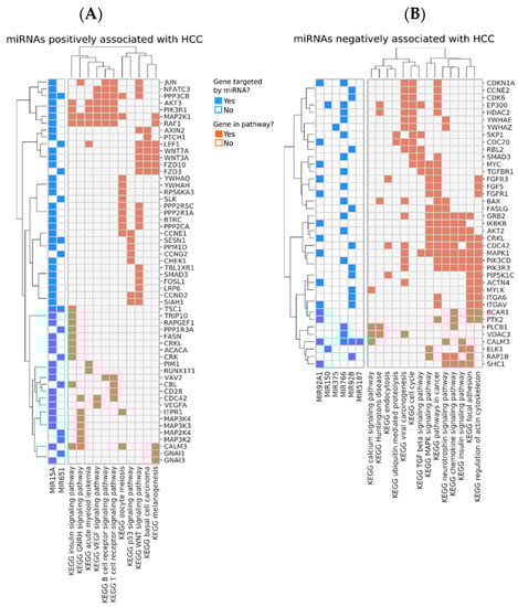 Pathways positively (A) or negatively (B) associated with the subsequent development of HCC. Genes targeted by the miRNAs are shown in rows. The annotation matrix to the left matches each miRNA (shown at the bottom left) with the genes they regulate (shown in rows). The annotation matrix to the right matches each gene to the most enriched pathways they participate in, which are shown at the bottom.