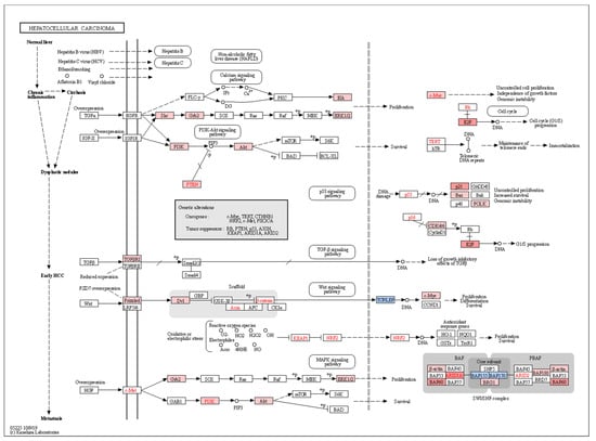 Pathways contributing to the development of hepatocellular carcinoma are differentially induced by miRNA dysregulation in HCC donors. Genes regulated by miRNAs positively or negatively enriched in HCC compared to non-HCC donors are matched to KEGG hepatocellular carcinoma pathway. Genes in blue correspond to those modulated by miRNAs associated with HCC as shown in Figure 5A, and thus, differentially downregulated in HCC donors. Conversely, genes in red are regulated by miRNAs negatively associated with HCC (Figure 5B) and thus, are differentially upregulated in HCC donors due to loss of miRNA regulation in this subset of donors.