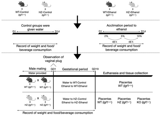 Wild-type (WT, Igf1+/+) and heterozygous (HZ, Igf1+/−) female mice 16 ± 8 weeks old were divided into four experimental groups: two control groups given water (WT-Control, n = 6; and HZ-Control, n = 6), and two other groups treated with food grade ethanol (WT-Ethanol, n = 4; and HZ-Ethanol, n = 9) (purity 96%, LaFe, Nuevo Leon, Mexico) (Figure 1).