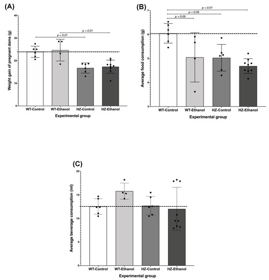 Effect of gestational ethanol consumption in maternal parameters: (A) weight gain, (B) average food consumption, and (C) average beverage consumption. Samples sizes were: WT-Control, n = 6; WT-Ethanol, n = 4; HZ-Control, n = 6; HZ-Ethanol, n = 9. Black dots represent the data dispersion. The statistical tests used were Student t-test and U Mann–Whitney test to compare wild-type (WT) and heterozygous (HZ) mice, and ANOVA or Kruskal–Wallis test to compare all experimental groups. Differences were considered significant when p < 0.05.