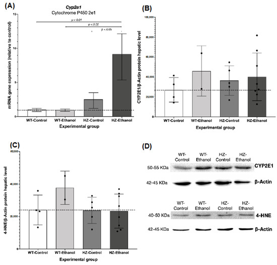 Regarding the protein levels in the liver, when grouped by treatment, a significant difference in CYP2E1 expression was found between the ethanol (WT-Ethanol and HZ-Ethanol) and control (WT-Control and HZ-Control) groups (p < 0.05), but no significant differences were observed when all of the experimental groups are compared to each other (Figure 3B,D, Supplementary Table S3 and Supplementary Figure S1).