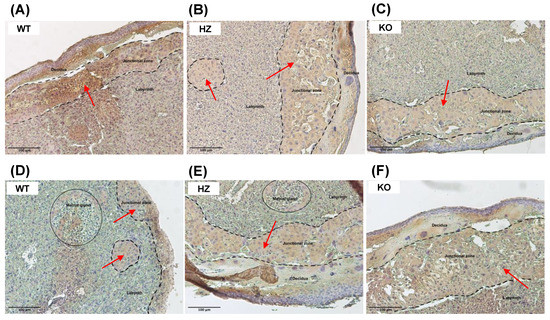 Effect of ethanol consumption during gestation in Cytochrome P450 2E1 (CYP2E1) levels analyzed by immunohistochemistry in placentas from wild-type (WT), heterozygous (HZ) and knock-out (KO) mice given water ((A), n = 5; (B), n = 6 and (C), n = 6) or ethanol ((D), n = 7; (E), n = 6 and (F), n = 5). Original magnification 100×. Scale bar = 100 μm. Representative images from one mouse of each group are included, where three principal layers of the placenta are observed: decidua, junctional zone, and labyrinth. Red arrows denote CYP2E1 expression in the junctional zone of the placenta, where trophoblast cells are expressed.