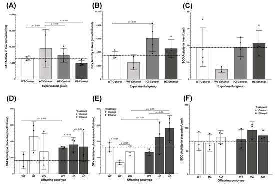 Effect of ethanol consumption throughout gestation in the antioxidant activities of catalase (CAT), glutathione peroxidase (GPx), and superoxide dismutase (SOD) in liver from pregnant dams (A–C), respectively) and placental tissues (D–F), respectively) from all experimental groups. Sample sizes for maternal livers were: WT-Control, n = 4; WT-Ethanol, n = 2; HZ-Control, n = 4; HZ-Ethanol, n = 4. Sample sizes for placentas from control and ethanol groups were WT, n = 3; HZ, n =3; KO, n = 3; for each treatment. Black dots represent the data dispersion. The statistical tests used were Student t-test to compare between two groups, ANOVA to compare between more than two groups, and general linear model to evaluate the effect of the two independent variables in the present study (ethanol consumption and IGF-1 deficiency). Differences were considered significant when p < 0.05.