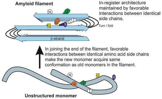 The in-register parallel folded beta-sheet architecture of yeast prion amyloids can explain their ability to template their conformation. H-bonds and hydrophobic interactions of identical amino acid side chains force adjacent molecules in the parallel beta-sheet to stay in-register and provide the fundamental force driving prions to template their conformation. A new monomer joining the end of the filament adopts a turn at the same place in the peptide chain as the molecules of that protein already in the filament in order to have those favorable side chain–side chain interactions. This is for prions what “Watson–Crick base pairing” is for DNA. The single letter amino acid code is used. Adapted from [34]. Not subject to U.S. Copyright.
