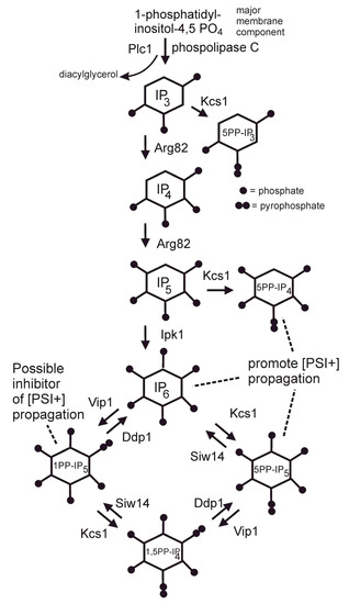 Inositol poly/pyro phosphate metabolism. On this diagram of the inositol polyphosphate biosynthesis pathways, the species that promote [PSI+] propagation are indicated [74]. Overproduction of 1-pyrophospo-inositolpentaphosphate (1-PP-IP5) inhibits [PSI+] propagation [74]. The mechanism by which the inositol pyro/polyphosphates affect prion propagation are unknown. Figure from [34].