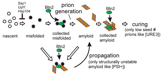 - Wickner, R.B.; Beszonov, E.; Bateman, D.A. Normal levels of the antiprion proteins Btn2 and Cur1 cure most newly formed [URE3] prion variants. Proc. Natl. Acad. Sci. USA 2014, 111, E2711–E2720. [Google Scholar] [CrossRef]