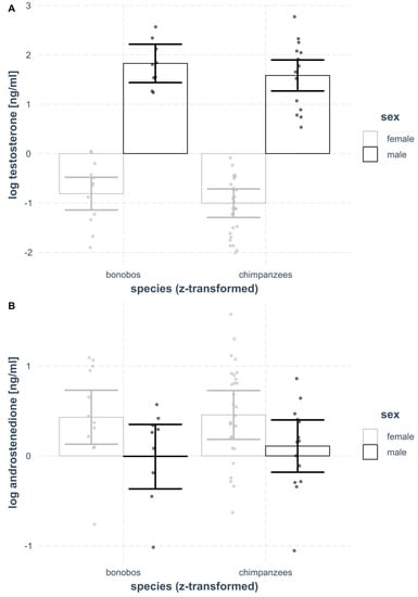 Another aspect that may have affected testosterone levels in our study subjects is the fact that samples were drawn while individuals were sedated; in some species some types of sedation and anesthesia were associated with lower (e.g., [65]) or increased (e.g., [66]) testosterone level measurements during and after sedation. In other studies, no relation between testosterone levels and anesthesia/sedation drugs (ketamine/xylazine) were found (e.g., [67,68]). To our knowledge, the effects of ketamine/xylazine, which are commonly used by zoo veterinarians for great apes, or any other anesthesia drug (such as barbiturates) have not yet been investigated in bonobos or chimpanzees. Therefore, it is difficult to assess the potential influences of sedation/anesthesia on our blood testosterone measurements. However, since all individuals represented in our study, independent of species, were anaesthetized when blood samples were drawn, the anesthesia effect should be constant across all samples.