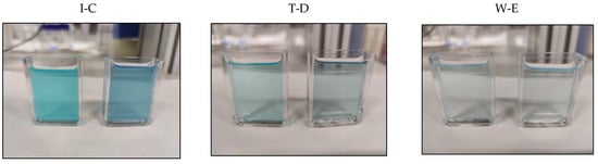 To determine the feasibility of using the already obtained C-PC extract as a colouring agent, a set of experiments were performed using different soft drinks. The colour exhibited by the blue C-PC extract obtained in this work was compared with the colour of the reference commercial products that were coloured using synthetic molecules. The most common synthetic blue food colours are anthraquinone blue (E-130), blue patent V (E-131), indigotine (E-132), and brilliant blue (E-133) while the most frequent natural molecule is anthocyanin (E-163) []. The standard commercial product was pigmented using the blue C-PC extract to achieve a colour that was as close as possible to that of the reference products. For this, it was necessary to add a specific volume of C-PC extract to the uncoloured commercial beverages (Table 2). It should be noted that the effect of the extract addition on texture and viscosity was negligible given that the added quantities needed to reproduce the colours of the corresponding market products were lower than 106 mg·L−1 in all the tests. Similar results were reported in previous works where natural pigments did not affect the rheological properties of dairy products []. In this work, tonic beverages required a smaller amount of C-PC to match the colour of the commercial products. Samples D and E had staining factors of 22 and 47.9 mg·L−1, respectively. In contrast, Sample B was the product requiring the most protein, having a staining factor of 105.8 mg·L−1. These results show the C-PC extract’s potential as a natural colourant while the low staining factor values confirm its economic viability. Figure 1 shows the samples coloured with the C-PC extract compared with the reference products found on the market. These images demonstrate that the colour of each sample was similar to the colour of the commercial reference product. In addition, Figure 3 shows the colouring curves of the different beverages. When the ΔE*ab value is in the 0.0–0.5 range, the colour difference is imperceptible to the human eye, whereas values in the 0.5–1.5 range are slightly different and higher values are easily detected by an untrained consumer [].