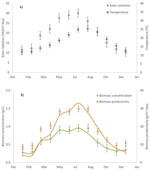 Annual variation in (A) environmental conditions (solar radiation and culture temperature) and (B) biomass production (concentration and productivity) of Oscillatoria sp. cultures cultivated in an 80 m2 raceway reactor operated in semicontinuous mode at 0.2 day−1. Lines correspond to values estimated using the previously developed model [].