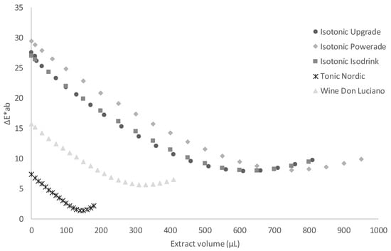 Three different commercial isotonic beverages were studied to test the potential colouring capacity of the C-PC extract (Table 2). The final colours present notable differences, although these are probably not enough for consumers to find them unattractive. Further studies will assess consumer acceptance of the products. The products developed in this work had the additional advantage of being produced using a natural colourant. Recent work demonstrated that, if consumers are aware of the health and environmental benefits of incorporating natural microalgae-derived products into foods, not only their purchase intention but also the amount of money they are willing to pay for the product is greater []. Sample B registered the highest staining factor (Table 2) and its colouring curve suggests that a large volume of the B-PE extract (750 μL) was needed to achieve the final sample colour (Figure 3). However, in all the studied samples, the staining factors were low, proving that attractive colours can be achieved with a very low quantity of the C-PC.