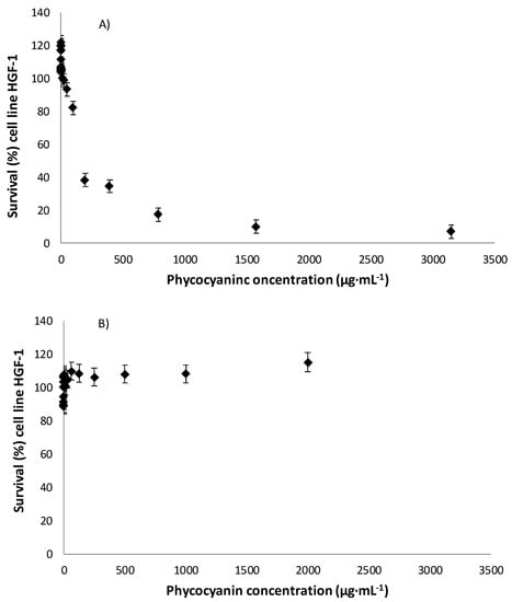 Survival of the HGF-1 cell line as a function of the C-phycocyanin concentration for the obtained extract (A) and Sigma’s 99.9% purity of phycocyanin (B).