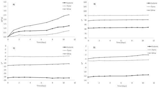 Changes in the colour indexes of the isotonic beverage, the tonic beverage, and the wine pigmented with the C-PC extract during a short cold-storage period. The plotted values are the means of the triplicate tests. Graphs show changes in ∆E*ab (A), L* (B), a* (C), and b* (D).