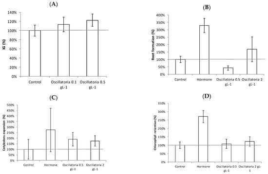 The results confirm the potential use of leftover Oscillatoria biomass as a biostimulant product since all the bioassays carried out in this work demonstrated the presence of gibberellin-like (the germination index), auxin-like (mung bean root formation), and cytokinin-like (cucumber expansion and chlorophyll retention) effects. Similar results were found using different microalgae and cyanobacteria such as Scenedesmus obliquus [], Nostoc piscinale [], and Chlorella [,], amongst others. The benefits of using these microalgae-related biostimulants in agriculture have been widely reported, although more research is still needed to identify the mechanisms involved in improved crop performance [,].