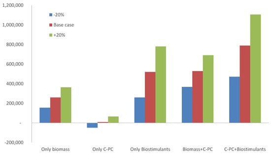 In terms of the biorefinery schemes, producing C-PC extracts while valorising the residual biomass is profitable, although the best scenario is one in which both C-PC extracts and biostimulants are produced (Figure 7). These results confirm the benefits of developing biorefineries capable of increasing the number and value of the products already obtained from the biomass, which results in increased profits from the process. However, not all the scenarios are positive as the selection of suitable products is critical. The findings indicate that high-value products are not always the most suitable to obtain, especially if the valuable compounds are present in the biomass at concentrations that are too low. Instead, producing large amounts of medium-value products is very important when it comes to maximising the benefits of microalgae-related processes.