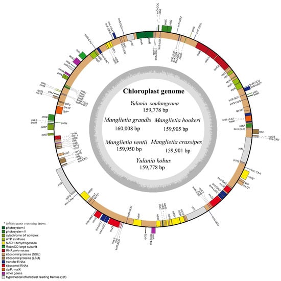 Structural map of the six chloroplast genomes of Magnoliaceae species.