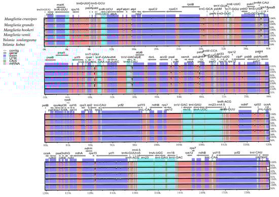 Alignment of whole chloroplast genome sequences from the six Magnoliaceae species.