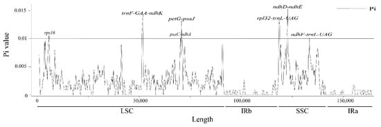 To investigate the levels of sequence polymorphism, the six cp genomes of Magnoliaceae species were compared (Figure 2). The results showed that the structures, orders and contents of these six cp genomes were all conserved. The Pi values of these six genomes ranged from 0 to 0.0153. Although aligned sequences showed relatively low divergences, some hotspot regions with high variation were also identified. The variable regions with Pi exceeding 0.01 in the six cp genomes were ndhF-trnL-UAG, ndhD-ndhE, rpl32-trnL-UAG, petG-psaJ, psaC-ndhA, trnF- and GAA-ndhK (Figure 3).