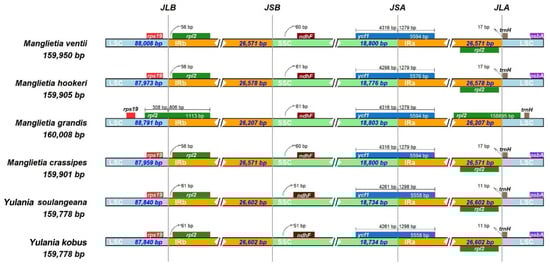 Comparison of the border regions of the six chloroplast genomes of Magnoliaceae. Note: Different genes are denoted by colored boxes. The gaps between the genes and the boundaries are indicated by the base lengths (bp).