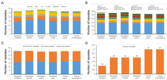 Comparison of repeats in six species of Magnoliaceae family. Note: (A) The type frequency of different SSR types. (B) The type frequency of SSR motifs in different repeat class types. (C) The type frequency of different repeat types. (D) The type frequency of dispersed repeat sequences.