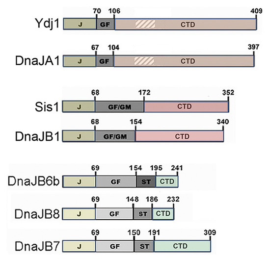 J-domain proteins (Figure 1, see [66]) are Hsp70 co-chaperones defined by a conserved J domain, which interacts with Hsp70 to regulate its ATPase and substrate binding cycle. The roughly 40-kDa Hsp40 subfamily of JDPs typically encodes an adjacent glycine-phenylalanine (GF) rich region—sometimes extended by glycine and methionine (GM)—that contributes to functional specificity, followed by a C-terminal substrate binding domain (CTD) that encodes a dimerization region near its terminus. The homologous yeast Ydj1 and human DnaJA1 are the major class-A Hsp40 subfamily members. Class A Hsp40s also possess a zinc-binding region embedded in the CTD. The homologous yeast Sis1 and human DnaJB1 are the major class B subfamily members. The human class B family can be divided into two clusters, one of which includes the highly similar DnaJB6b and DnaJB8. DnaJB6b and DnaJB8 have much shorter CTDs and a serine-threonine-rich region that binds amyloids [67]. DnaJB7 is similar but localizes to the nucleus and has a longer CTD.