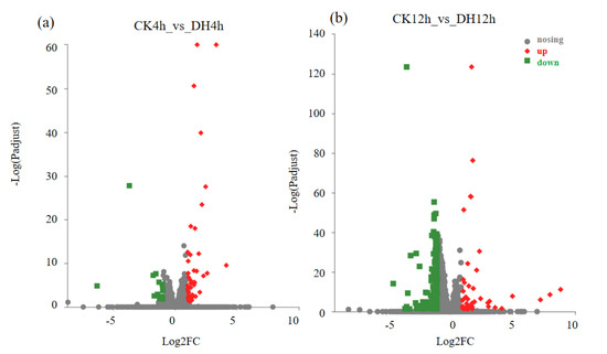Volcano plot of DEGs identified in ovaries at 4 h (a) and 12 h (b) after DH injection. X-axis: log2−fold change (treatment/control). Y-axis: log10(FDR). Red data points indicated up-regulated unigenes and green data points indicated down-regulated unigenes.