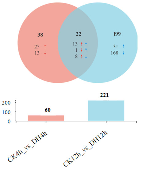Number of differentially regulated genes in response to DH. Numbers of DEGs (|FC| > 2 and p-adjust < 0.05) between control and DH-treated for 4 h and 12 h. The circles of different colors represent the genes in a gene set, where the value represents the number of genes shared or unique between CK4h_vs._DH4h and CK12h_vs._DH12h.
