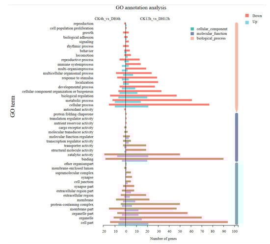 GO annotation analysis of DEGs in CK4h_vs._DH4h group and CK12h_vs._DH12h group. The vertical axis represents number of DGEs mapped to indicated GO term, and the horizontal axis represents each GO term. Red and blue bars represent up-regulated and down-regulated genes, respectively.