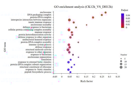To investigate the functional significance of the DEGs identified above, GO function annotations and enrichment analysis were executed. All DGEs were classified into three main GO categories: biological process, cellular component, and molecular function, and then to 45 functional categories. In these functional groups, GO terms in CK4h_vs._DH4h were similar to CK12h_vs._DH12h (Figure 4 and Table S4). GO term enrichment analysis showed that when considering p-adjust < 0.05, none of the GO terms were significantly enriched between CK_4h and DH_4h. The DEGs between CK_12h and DH_12h were significantly enriched for 25 GO terms (Figure 5 and Table S5). The majority of the DEGs were engaged in the biological process, including immune response. In the cellular component group, the DEGs were all involved in chromatin formation, including nucleosome, DNA packaging complex, and protein–DNA complex. In the molecular function group, the majority of DEGs were engaged in protein heterodimerization activity, structural molecule activity, and structural constituent of ribosome.