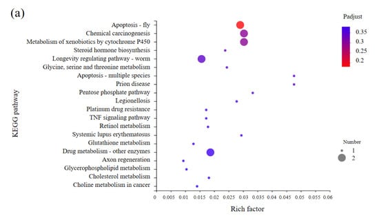 To investigate the influence of metabolism pathways after DH injection between 4 h and 12 h, we carried out KEGG enrichment analysis for DEGs in CK4h_vs._DH4h group (Table S6) and CK12h_vs._DH12h group (Table S7). The top 20 abundant pathways were shown in Figure 6. The result showed that DEGs in CK4h_vs._DH4h group were mostly enriched in apoptosis, which were related to cell growth and death. In addition, several pathways related to metabolism were also enriched, like metabolism of xenobiotics by cytochrome P450, steroid hormone biosynthesis and glycine, serine and threonine metabolism et al. (Figure 6a). However, DEGs in CK12h_vs._DH12h were also enriched in a variety of immune related pathways, such as toll and imd signaling pathway and leukocyte transendothelial migration (Figure 6b). These results indicated that inject DH can affect the metabolism and immune of early ovary development.