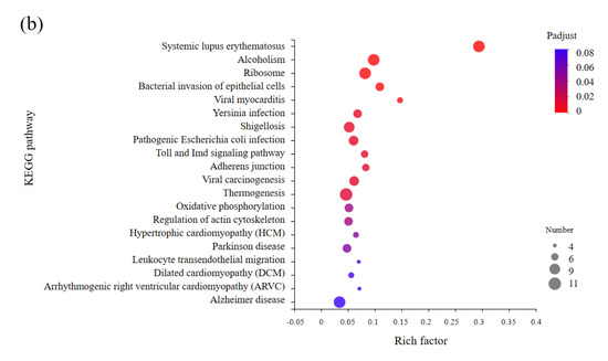 Top 20 pathways of KEGG enrichments analysis. (a) DEGs in CK4h_vs._DH4h group; (b) DEGs in CK12h_vs._DH12h group. The vertical axis represents pathway name and the horizontal axis represents rich factor. A greater rich factor indicates a greater degree enrichment. The size of the plot represents the number of DEGs in this pathway. The color of the plot corresponds to different p−adjust ranges.