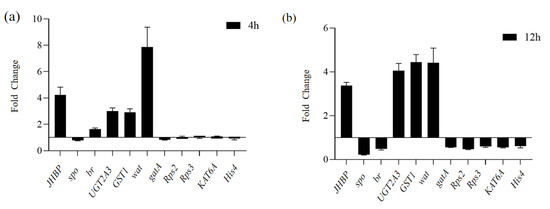 In order to confirm the reliability of the RNA-Seq data in the present study, the 11 genes including JHBP, spo (spook), br, UGT2A3, GST1, Wat, gatA (fatty-acid amide hydrolase 2-like), Rps2 (ribosomal protein S2), Rps3 (ribosomal protein S3), KAT6 (histone acetyltransferase KAT6A isoform X1), and His4 (histone H4) were selected to perform qRT-PCR. The results showed that the qRT-PCR and RNA-Seq expression patterns of these 11 differential genes were consistent (Figure 7 and Figure S4), indicating that the transcriptome data are authentic and reliable, and can be used for subsequent analysis. The 11 DEGs showed remarkable differences, which are also consistent with the results obtained from the RNA sequencing data.