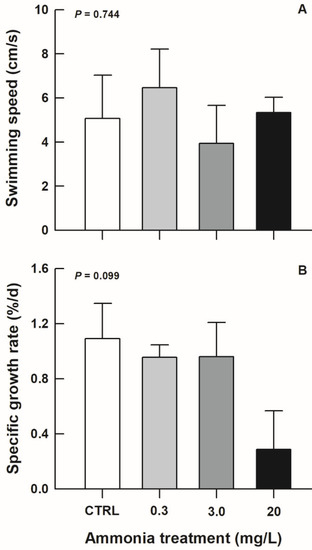 Swimming speed (A) and specific growth rate (B) of Trachemys scripta elegans juveniles exposed to CTRL, 0.3, 3.0, and 20 mg/L ammonia.