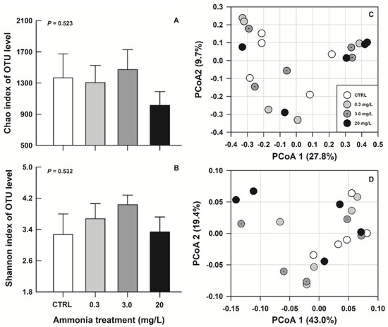 The Chao (A), Shannon–Wiener (B) index, and score plots for unweighted (C) or weighted (D) principal coordinates analysis for gut microbiota of Trachemys scripta elegans juveniles exposed to CTRL, 0.3, 3.0, and 20 mg/L ammonia.