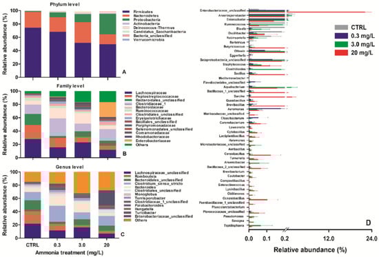 Further taxonomic analysis showed that Firmicutes (61.0 ± 6.5%), Bacteroidetes (22.8 ± 3.9%), and Proteobacteria (12.8 ± 5.5%) were the most predominant phyla (Figure 3A). Although the relative abundance of Firmicutes seemed to have decreased, while that of Proteobacteria had increased with increasing ammonia concentration, among-group differences were not statistically significant in these phyla (Kruskal–Wallis test, all p > 0.353). At the family level, the relative abundance of some bacterial families were different among groups (Figure 3B). For example, the relative abundance of Enterobacteriaceae appeared to be higher in the 20 mg/L-exposed group (22.32 ± 15.00%) than in other groups (CTRL: 0.06 ± 0.04%; 0.3 mg/L-exposed: 0.71 ± 0.32%; 3.0 mg/L-exposed: 0.47 ± 0.24%) (Figure 3B); although some pathogenic bacterial families (such as Aeromonadaceae and Pseudomonadaceae) accounted for a very low proportion, they were mainly found in high-concentration exposure groups (e.g., 0.06 ± 0.03% and 0.04 ± 0.02% in the 20 mg/L-exposed group). At the genus level, more than 30 genera were identified. Of them, Clostridium_sensu_stricto (15.50 ± 3.84%), Bacteroides (10.29 ± 3.31%), Romboutsia (9.06 ± 4.26%), Terrisporobacter (2.62 ± 0.87%), Parabacteroides (1.69 ± 0.70%), Hungatella (1.53 ± 0.69%), Turicibacter (1.51 ± 0.55%), Monoglobus (1.21 ± 0.52%), and some unclassified genera belonging to Lachnospiraceae (14.24 ± 3.45%), Bacteroidales (8.94 ± 3.40%), Enterobacteriaceae (5.81 ± 4.06%), Clostridiales (3.06 ± 0.88%), and Clostridiaceae_1 (1.41 ± 0.38%) were the most predominant genera (Figure 3C,D). The relative abundance of some identified bacterial genera differed among the treatment groups. For example, despite accounting for a very low proportion, the relative abundances of some pathogenic bacterial genera, such as Aeromonas (CTRL vs. 20 mg/L-exposed group: 0.002 ± 0.002% vs. 0.06 ± 0.02%) and Pseudomonas (0 vs. 0.02 ± 0.01%), were increased in high-concentration-exposed turtles (Figure 3D).