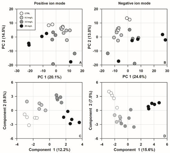 Score plots for principal component analysis (PCA), in the positive (A) and negative (B) ion mode, and partial least squares–discriminant analysis (PLS-DA), in the positive (C) and negative (D) ion mode of hepatic metabolite profiles showing separation among different treatment groups of Trachemys scripta elegans juveniles.
